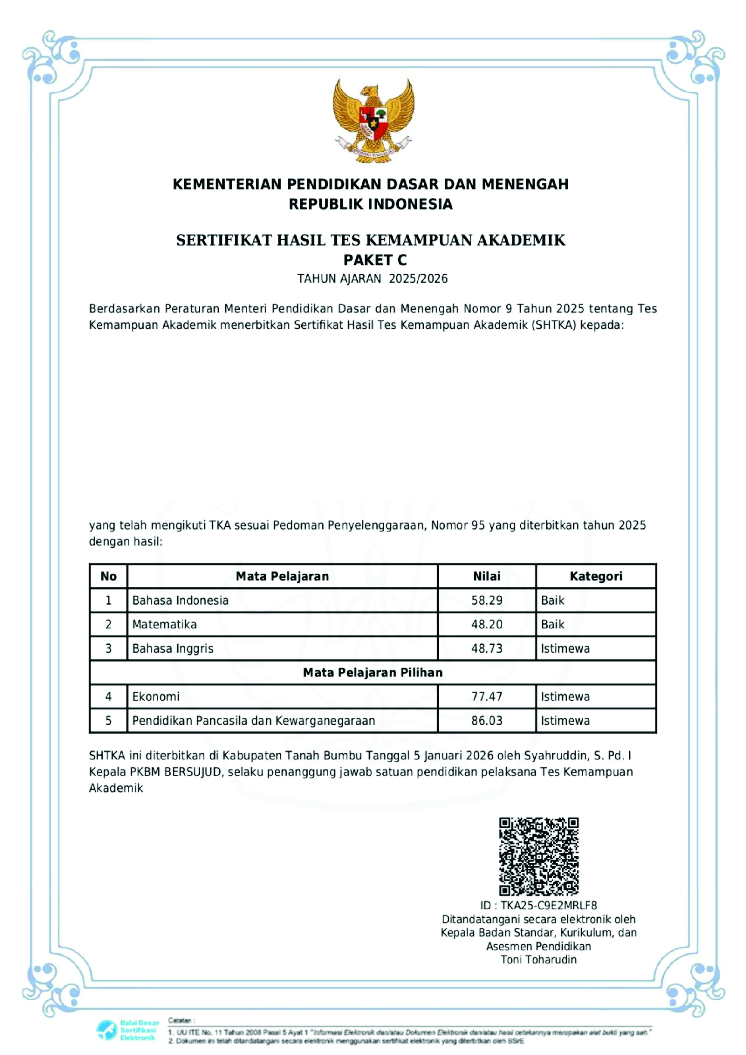Tes Kemampuan Akademik (TKA) merupakan kegiatan evaluasi yang bertujuan untuk mengukur kemampuan dasar peserta dalam bidang pengetahuan umum, logika, serta pemecahan masalah. Melal